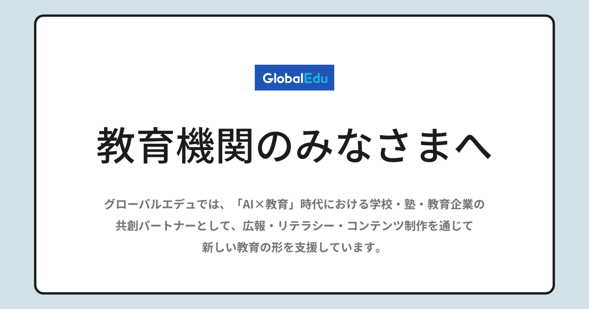 グローバルエデュでは、「AI×教育」時代における学校・塾・教育企業の共創パートナーとして、広報・リテラシー・コンテンツ制作を通じて新しい教育の形を支援しています。
