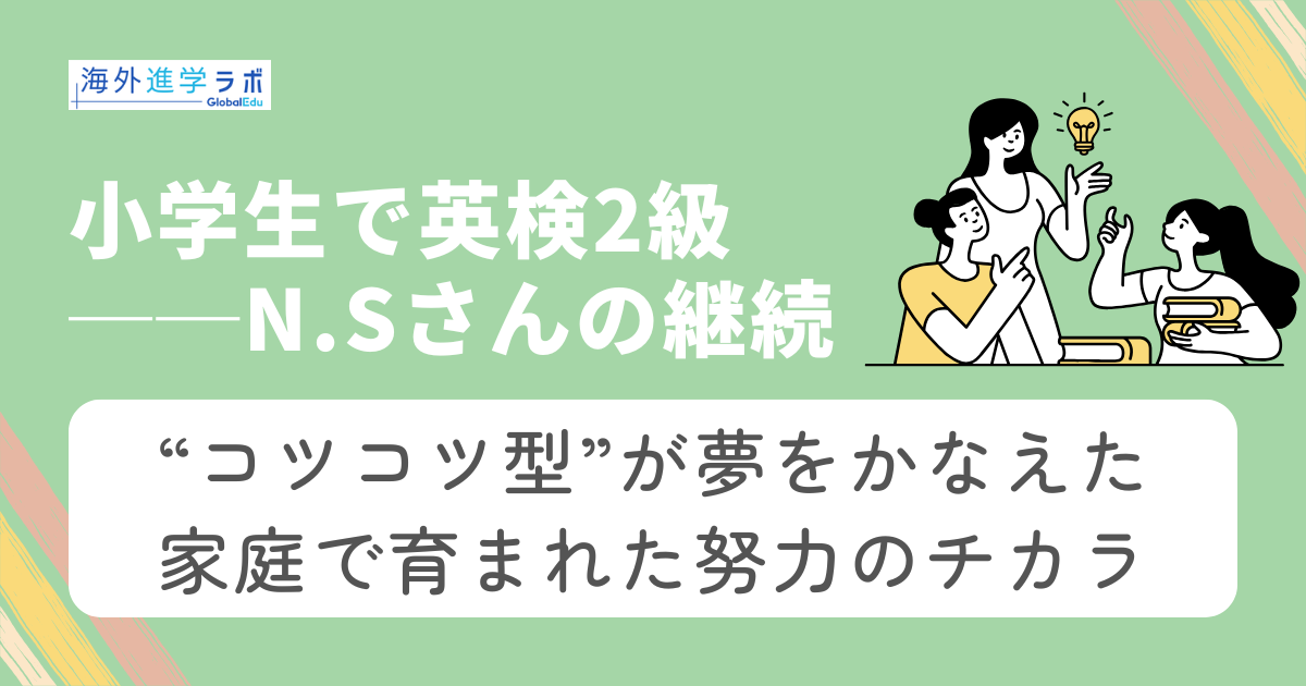 小4で英検2級を取得したN.S.さん。くもんと英会話スクールを両立しながら、家庭で少しずつ英語に向き合ってきました。“コツコツ型”の努力で夢を実現した学びのプロセスを紹介します。