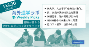 「海外進学ラボ Weekly Picks」は、グローバル進学に関心のある中高生・保護者向けに、世界の教育ニュースを厳選してお届けしています。進路のヒントが“5分”で見つかる週刊特集です。